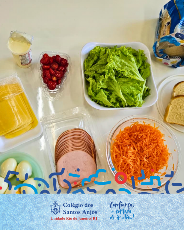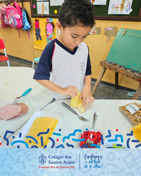 A turma do Pré 2, da professora Stephany Bahia, vivenciou uma atividade prática de preparo de sanduíches, integrando aprendizagem e cuidado com a saúde. Cada criança trouxe um ingrediente e, em conjunto, montou seu próprio lanche, explorando diferentes possibilidades dentro da proposta de alimentação saudável.